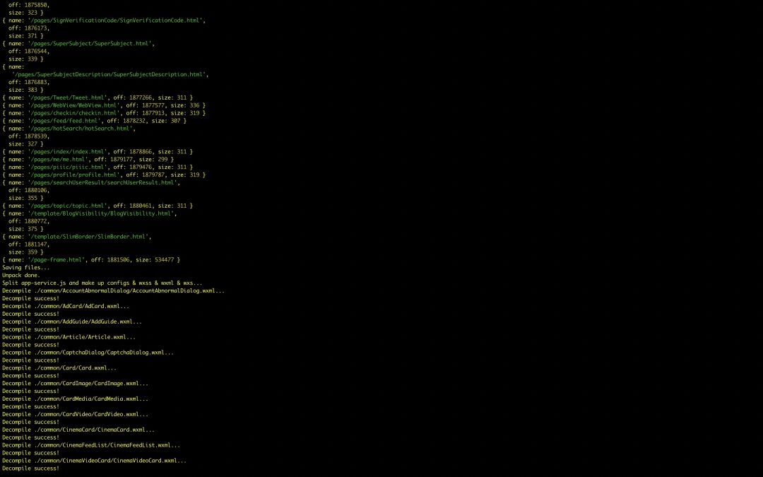 兜兜转转绕了一圈终于拿到小程序的 .wxapkg 包,接下来就是如何将它反编译成为一个完整的项目了。