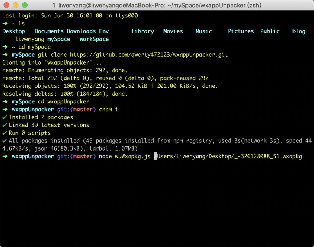 • 打开终端,用git下载代码 git clone https://github.com/qwerty472123/wxappUnpacker.git